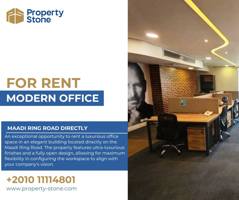 فرصة استثنائية لاستئجار او للاستثمار لمكتب إداري راقٍ داخل مبنى أنيق في اقوي كومبلكس اداراي علي دائري المعادي. يتميز المكان بتشطيبات سوبر ديلوكس ومساحات واسعة مفتوحة بالكامل تمنح مرونة كاملة لتخطيط مقر شركتك بالشكل الذي يناسب رؤيتك.