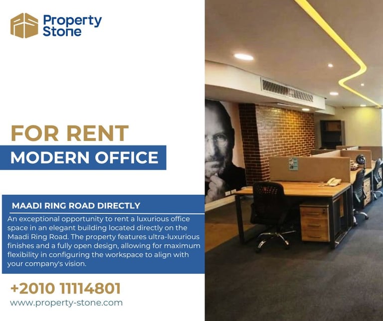 فرصة استثنائية لاستئجار مكتب إداري راقٍ داخل مبنى أنيق في اقوي كومبلكس اداراي علي دائري المعادي. يتميز المكان بتشطيبات سوبر ديلوكس ومساحات واسعة مفتوحة بالكامل تمنح مرونة كاملة لتخطيط مقر شركتك بالشكل الذي يناسب رؤيتك.